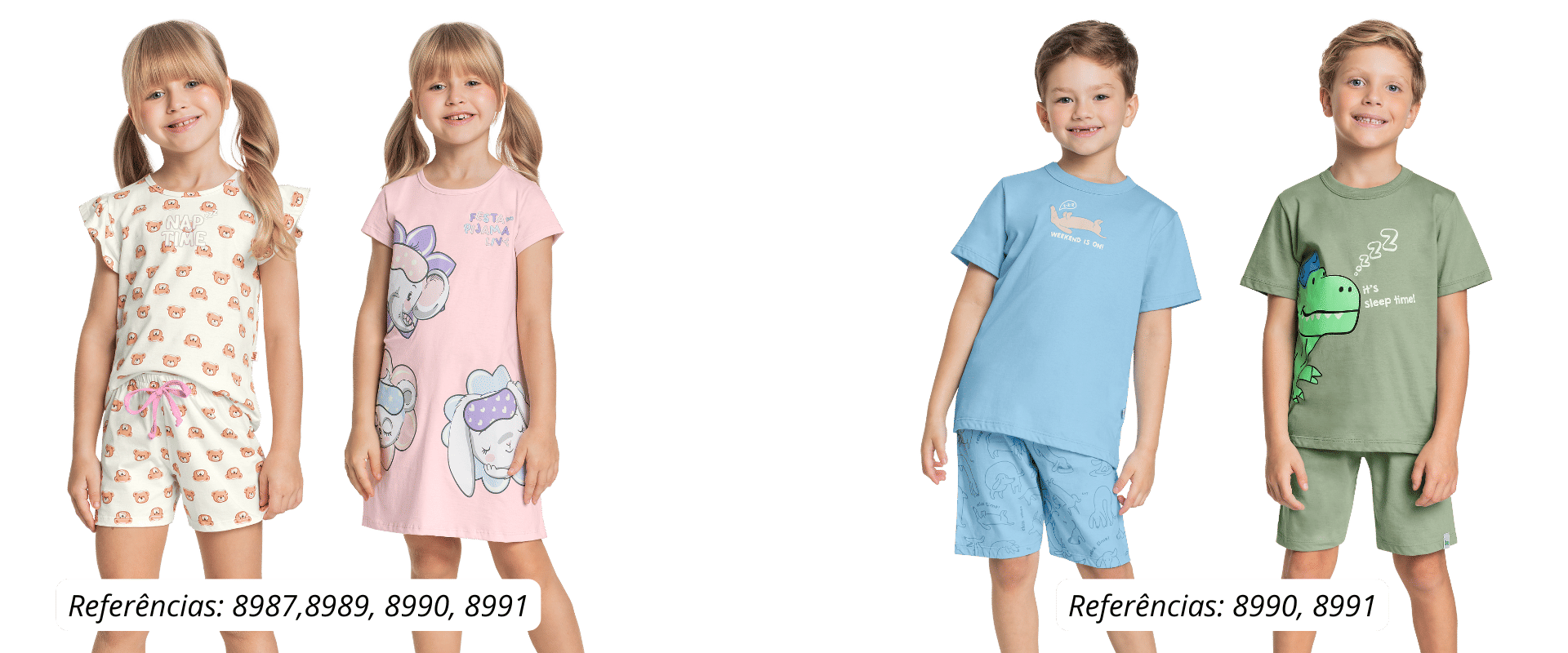 Pijamas confortáveis e divertidos: Escolha modelos que sejam macios e tragam alegria para a hora de dormir, com estampas ou detalhes especiais. Nossos pijamas da Livy da coleção de Alto Verão 25 são super divertidos e acompanham cartela de tatuagem que brilha no escuro. Confira algumas referências abaixo: